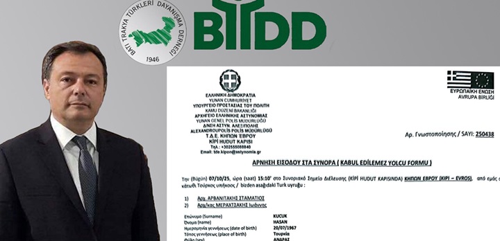 Batı Trakya Türkleri Dayanışma Derneği (BTTDD) Genel Başkanı Hasan Küçük’e Yunanistan’a giriş yasağı konuldu. Dernek tarafından yapılan açıklamaya göre, yasak 7 Ekim 2025 Salı günü saat 15.10’da Türkiye-Yunanistan sınırındaki Bahçeköy (Kipi) Sınır Kapısı’nda uygulandığı belirtildi.